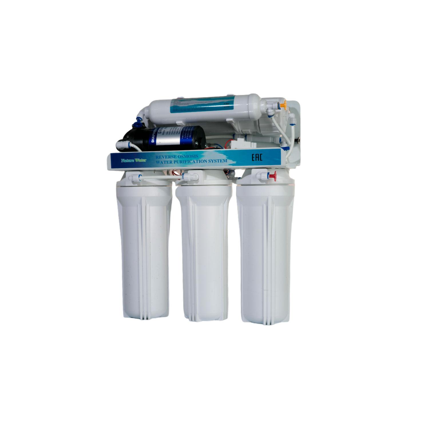 5-ти стадийная система очистки воды на основе обратного осмоса NatureWater с насосом для повышения давления (применяется при низком исходном давлении в системе водопровода).