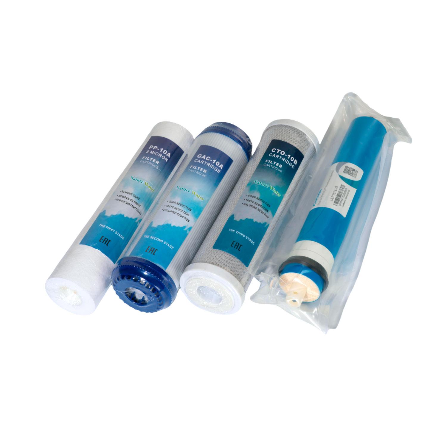 Описание и применение системы обратного осмоса NatureWater:Пятиступенчатая система обратного осмоса NatureWater работает по принципу проникновения молекул сквозь тонкопленочную полупроницаемую мембрану с порами 0,0001 микрон под давлением. В процессе обратного осмоса происходит отделение молекул воды от всех остальных примесей и загрязнений, после чего на выходе получается полностью чистая вода. Чтобы сделать воду более полезной и насытить её минералами, используется минерализатор или биокерамический фильтр, как опция или в других моделях. Система обратного осмоса NatureWater устанавливается под мойку, а вода подается через кран, установленный на раковине или столешнице.Ступени очистки системой обратного осмоса: